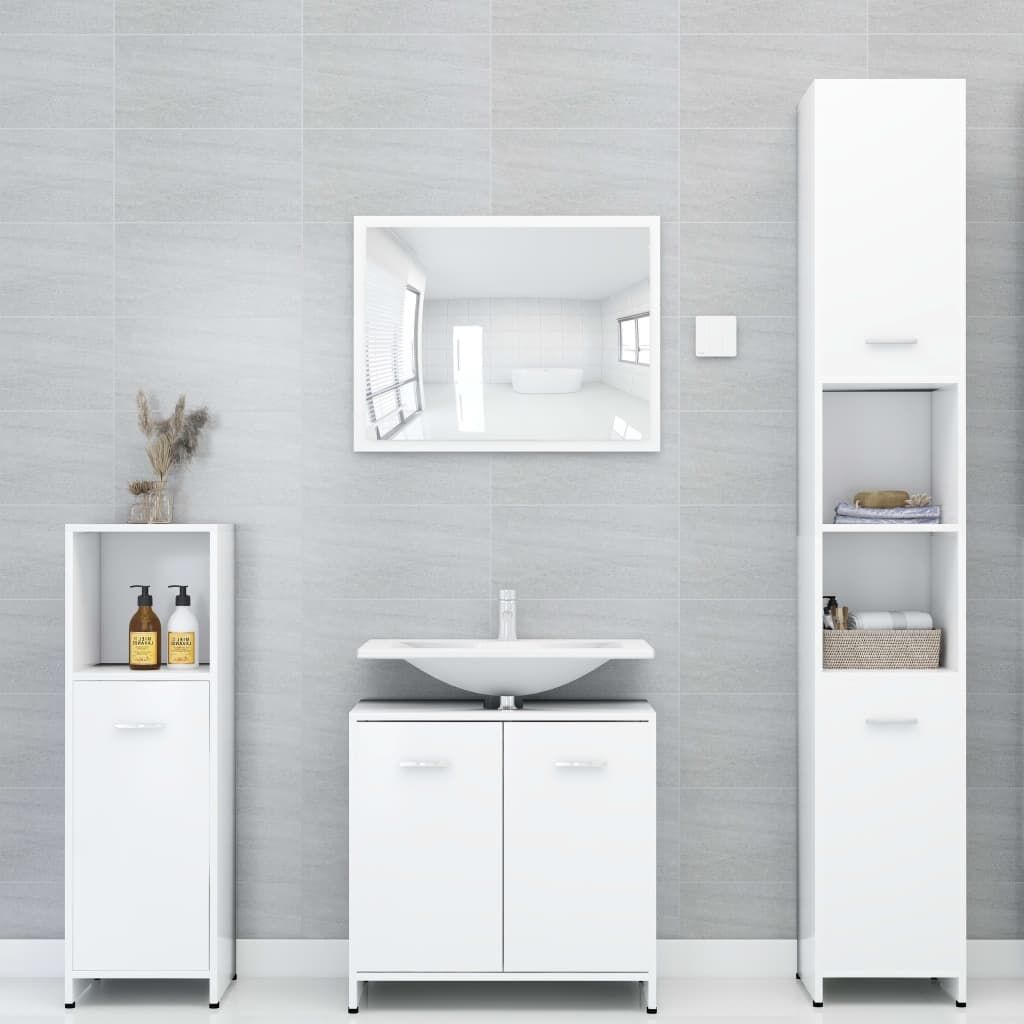 This stylish bathroom furniture set, featuring 1 high cabinet, 1 under basin cabinet and 1 mirror, creates additional storage space for your bathroom with a stunning and neat appearance. Made of premium engineered wood, this set is durable and stable. The chic high cabinet has 6 compartments and 2 doors, offering spacious space to store items in your bathroom. The basin cabinet has 1 compartment and 2 doors, providing ample space to store your toiletries, beauty products and various kinds of smaller items. You can even organise combs, cosmetics, toothbrushes and toothpaste in the shelves conveniently within reach. The mirror adds an excellent appearance to your existing home decor. Additionally, this bathroom set is easy to clean with a damp cloth.