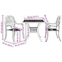 Enjoy a cup of coffee or have a chat with your family and friends in the garden, backyard, or on the balcony with this bistro set! Sturdy and durable frame: The garden bistro set, made of cast aluminium, is sturdy and durable enough to provide long-term service. The rust-resistant and weather-resistant material makes it ideal for outdoor use all year round.Comfortable seating experience: The high backrest and seat with a hollow design are comfortable and stylish. Ergonomically curved armrests can effectively relax your arms as well.Practical design: This garden table has an umbrella hole that can perfectly accommodate your umbrella to protect you from sun or rain.Wide applications: The bistro set is perfect for any front porch, patio, backyard, lawn, garden, etc. Good to know:To make sure your outdoor furniture stays beautiful, we recommend protecting it with a waterproof cover.