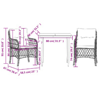 Enjoy a coffee or have a chat with your family and friends in the garden, backyard, or on the balcony with this comfortable bistro set! Durable material: PE rattan, also known as poly rattan, is a strong, low-maintenance synthetic material that looks like natural rattan. It's lightweight, easy to clean, and commonly used for outdoor furniture due to its durability and weather-resistant properties.Comfortable seat experience: This outdoor furniture set, complete with thickly padded cushions, offers a comfortable seating experience.Removable and washable cover: These seat cushions feature removable covers for easy washing and maintenance.Glass tabletop: The outdoor table's top is made from strong and durable tempered glass, making it easy to clean with a damp cloth and adding a touch of elegance to your outdoor space. Good to know:To make sure your outdoor furniture stays beautiful, we recommend protecting it with a waterproof cover.