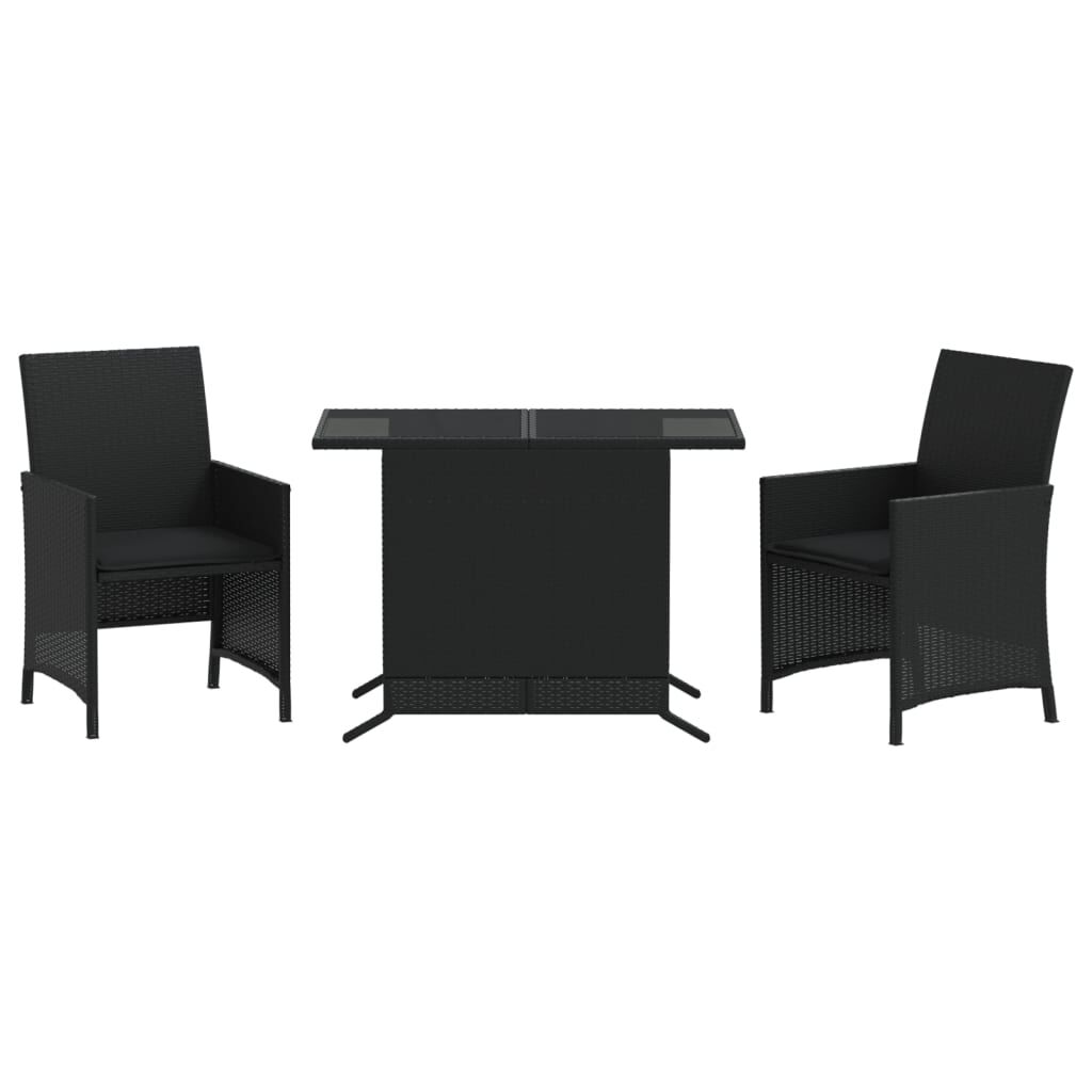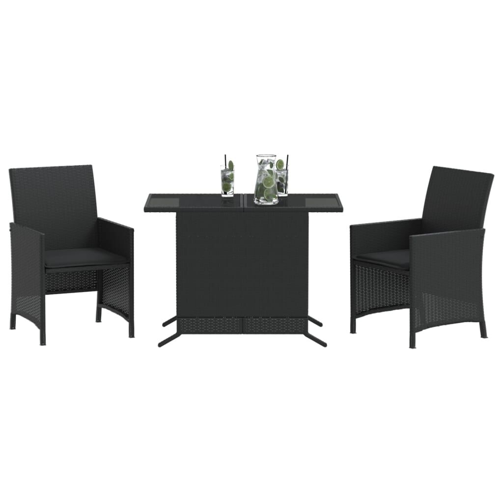 Enjoy a cup of coffee or have a chat with your family and friends in the garden, backyard, or on the balcony with this comfortable bistro set! Durable material: PE rattan, also known as poly rattan, is a strong, low-maintenance synthetic material that looks like natural rattan. It's lightweight, easy to clean, and commonly used for outdoor furniture due to its durability and weather-resistant properties.Comfortable seat experience: This outdoor furniture, complete with thickly padded cushions, offers a comfortable seating experience.Removable and washable cover: These seat cushions feature removable covers for easy washing and maintenance.Compact storage: These garden chairs can be neatly tucked underneath the table, allowing for space-saving storage.Glass tabletop: The outdoor table's top is made from strong and durable tempered glass, making it easy to clean with a damp cloth and adding a touch of elegance to your outdoor space. Good to know:To make sure your outdoor furniture stays beautiful, we recommend protecting it with a waterproof cover.