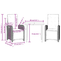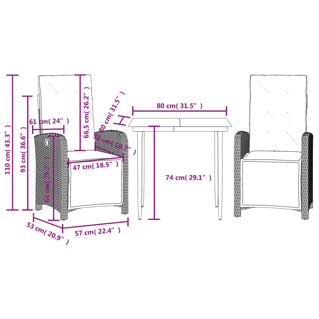 Enjoy a cup of coffee or have a chat with your family and friends in the garden, backyard, or on the balcony with this comfortable bistro set! Durable material: PE rattan, also known as poly rattan, is a strong, low-maintenance synthetic material that looks like natural rattan. It's lightweight, easy to clean, and commonly used for outdoor furniture due to its durability and weather-resistant properties.Adjustable backrest and footrest: This garden seat has a handle. You can adjust the backrest and footrest to any position by pulling the handle, and quickly return them to their original positions.Comfortable seat experience: This outdoor furniture, complete with thickly padded cushions, offers a comfortable seating experience.Removable and washable cover: These seat cushions feature removable covers for easy washing and maintenance. The back cushions have a flap at the back for easy attachment to the backrests.Glass tabletop: The outdoor table's top is made from strong and durable tempered glass, making it easy to clean with a damp cloth and adding a touch of elegance to your outdoor space. Good to know:To make sure your outdoor furniture stays beautiful, we recommend protecting it with a waterproof cover.