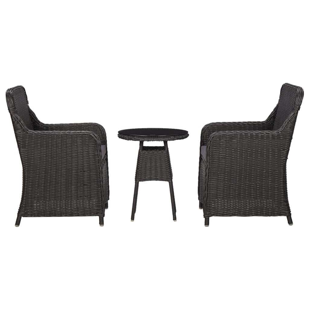 $343.09Add a hint of modern style with our poly rattan chair set with a tea table. Capable of completing an outdoor dining set or standing out on their own, this chair set will make a statement in any setting. Featuring a sturdy steel frame wrapped with weather resistant hand woven PE rattan, this set is rust and mildew proof, which can provide years of quality relaxation. It is also delivered with highly comfortable, thickly-padded seat cushions for the ultimate comfort. Equipped with zips, the low-maintenance polyester covers can be removed and washed. Additionally, the black glass table top is easy to wipe clean with a damp cloth. Delivery includes 2 chairs, 1 tea table and 2 seat cushions. Note: We recommend covering the set in the rain, snow and frost.