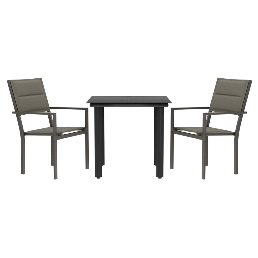 Enjoy a nice meal or afternoon tea in your outdoor space with this garden dining set! Featuring an elegant design, it will become the focal point of your garden and patio! Stable frame: The armchairs and table have a powder-coated steel construction, making them sturdy and stable.Durable material: Thanks to the strong textilene fabric with padding, these outdoor chairs are highly comfortable, weather-resistant and easy to clean.Sturdy tabletop: The tabletop is made of tempered glass, making it easy to clean. Additionally, the tabletop is perfect for placing snacks, drinks, vases, fruit bowls, or other decorative items.Comfortable seating experience: The ergonomic backrest and armrests give you a better seating experience. Good to know:To make sure your outdoor furniture stays beautiful, we recommend protecting it with a waterproof cover.