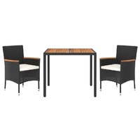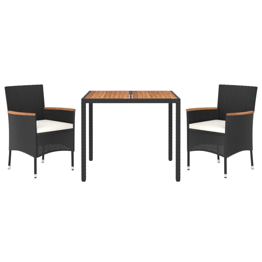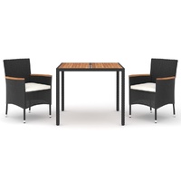 This stylish garden dining set provides you with a leisurely and comfortable time with your family and friends. Weather-resistant material: PE rattan, also known as poly rattan, is weather resistant and easy to clean. It remains beautiful on the outside for a long period of time. It offers great quality, convenience and an aesthetic look. Solid acacia wood: Solid acacia wood is a beautiful natural material. Acacia wood is a tropical hardwood, which is dense, sturdy, and durable.Sturdy and stable frame: The powder-coated steel frame of the dining set ensures sturdiness and stability. Comfortable seat experience: The thickly padded cushions of the dining chairs provide the ultimate comfort for your sitting time.Practical table: The tabletop of the dining table is made of solid acacia wood which is easy to clean with a damp cloth. Additionally, the sturdy tabletop is perfect for placing meals, drinks, and other decorative items.Flexible design: Thanks to the lightweight construction, these garden dining chairs are easy to move. Note:To make sure your outdoor furniture stays beautiful, we recommend protecting it with a waterproof cover.