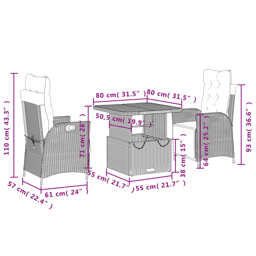 This garden dining set is a great choice for al fresco dining or just relaxing in the garden, backyard, or on the patio. Durable material: PE rattan, also known as poly rattan, is a strong, low-maintenance synthetic material that looks like natural rattan. It's lightweight, easy to clean, and commonly used for outdoor furniture due to its durability and weather-resistant properties.Adjustable backrest: This garden seat has a handle. You can adjust the backrest to any position by pulling the handle, and quickly return it to its original position.Adjustable tabletop: The tabletop can be lifted to make the table higher, which transforms the outdoor table from a coffee table to a dining table. It's perfect for having guests over or eating meals outside.Removable and washable cover: These seat cushions feature removable covers for easy washing and maintenance. The back cushions have a flap at the back for easy attachment to the backrests.Comfortable seat experience: This outdoor furniture, complete with thickly padded cushions, offers a comfortable seating experience. Good to know:To make sure your outdoor furniture stays beautiful, we recommend protecting it with a waterproof cover.