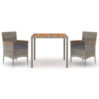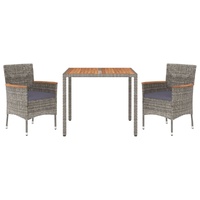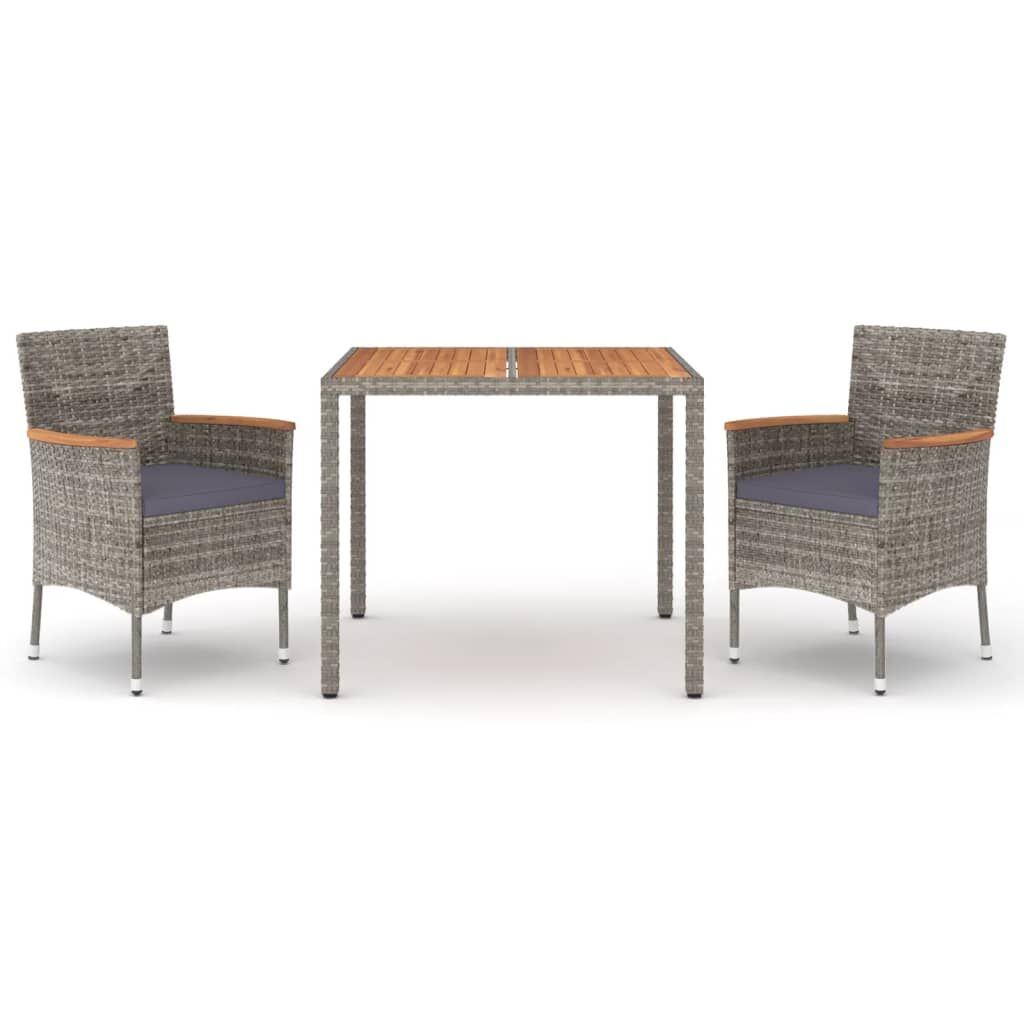 This stylish garden dining set provides you with a leisurely and comfortable time with your family and friends. Weather-resistant material: PE rattan, also known as poly rattan, is weather resistant and easy to clean. It remains beautiful on the outside for a long period of time. It offers great quality, convenience and an aesthetic look. Solid acacia wood: Solid acacia wood is a beautiful natural material. Acacia wood is a tropical hardwood, which is dense, sturdy, and durable.Sturdy and stable frame: The powder-coated steel frame of the dining set ensures sturdiness and stability. Comfortable seat experience: The thickly padded cushions of the dining chairs provide the ultimate comfort for your sitting time.Practical table: The tabletop of the dining table is made of solid acacia wood which is easy to clean with a damp cloth. Additionally, the sturdy tabletop is perfect for placing meals, drinks, and other decorative items.Flexible design: Thanks to the lightweight construction, these garden dining chairs are easy to move. Note:To make sure your outdoor furniture stays beautiful, we recommend protecting it with a waterproof cover.