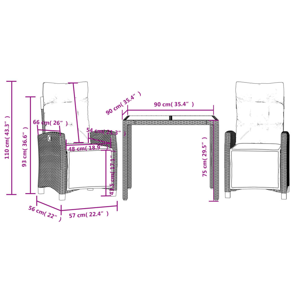 This garden dining set is a great choice for al fresco dining or just relaxing in the garden, backyard, or patio. Durable material: PE rattan, also known as poly rattan, is a strong, low-maintenance synthetic material that looks like natural rattan. It's lightweight, easy to clean, and commonly used for outdoor furniture due to its durability and weather-resistant properties.Adjustable backrest and footrest: This garden seat has a handle. You can adjust the backrest and footrest to any position by pulling the handle, and quickly return them to their original positions.Glass tabletop: The outdoor table's top is made from strong and durable tempered glass, making it easy to clean with a damp cloth and adding a touch of elegance to your outdoor space.Comfortable seat experience: This outdoor furniture, complete with thickly padded cushions, offers a comfortable seating experience.Removable and washable cover: These seat cushions feature removable covers for easy washing and maintenance. Good to know:To make sure your outdoor furniture stays beautiful, we recommend protecting it with a waterproof cover.