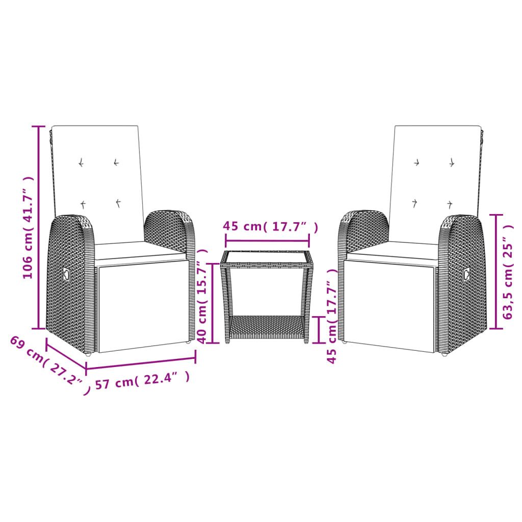 This garden dining set is a great choice for al fresco dining or just relaxing in the garden, backyard, or on the patio. Durable material: PE rattan, also known as poly rattan, is a strong, low-maintenance synthetic material that looks like natural rattan. It's lightweight, easy to clean, and commonly used for outdoor furniture due to its durability and weather-resistant properties.Adjustable backrest: This garden seat has a handle. You can adjust the backrest to any position by pulling the handle, and quickly return it to its original position.Comfortable seat experience: This outdoor furniture, complete with thickly padded cushions, offers a comfortable seating experience.Removable and washable cover: These seat cushions feature removable covers for easy washing and maintenance.Glass tabletop: The outdoor table's top is made from strong and durable tempered glass, making it easy to clean with a damp cloth and adding a touch of elegance to your outdoor space. Good to know:To make sure your outdoor furniture stays beautiful, we recommend protecting it with a waterproof cover.