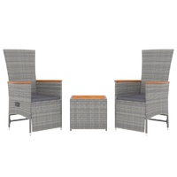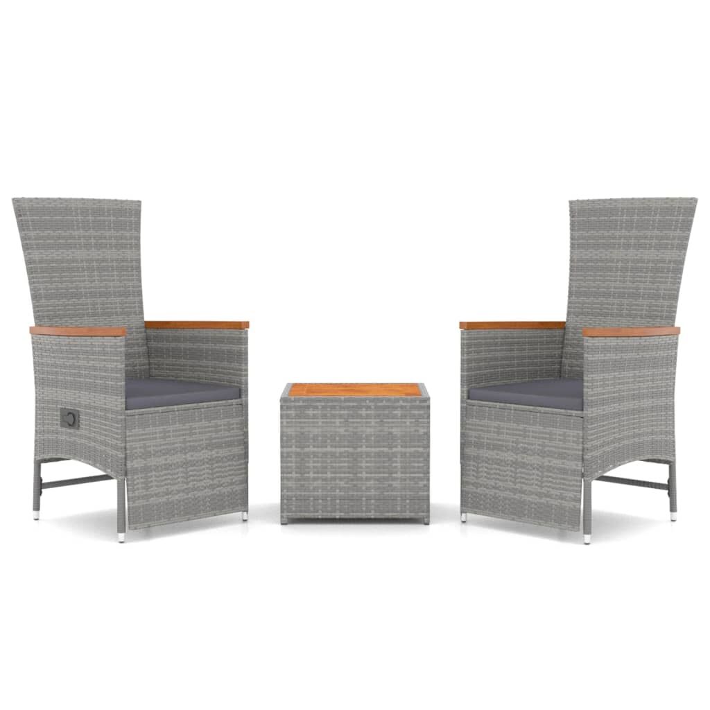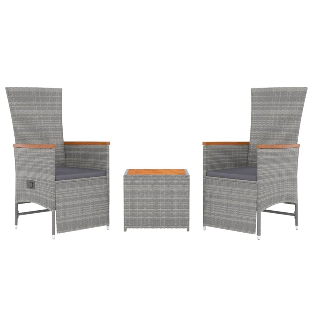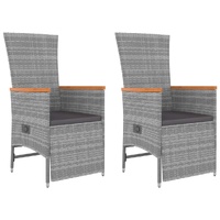 Cushion: Garden chair:Colour: GreyMaterial: PE rattan, steel, solid acacia wood with an oil finishSitting dimensions: 58 x 62 x 108 cm (W x D x H)Lying down dimensions: 58 x 121 x 96 cm (W x D x H)Seat size: 47 x 44 cm (W x D)Seat height from the ground: 43 cmArmrest height from the ground: 65/62 cmTable:Colour: GreyMaterial: PE rattan, powder-coated steel, solid acacia wood with an oil finishDimensions: 45 x 45 x 40 cm (W x D x H)Cushion:Colour: Dark greyCover material: Fabric (100% polyester)Seat cushion filling material: FoamSeat cushion thickness: 4 cm Delivery contains:2 x Garden chair1 x Table2 x Seat cushion