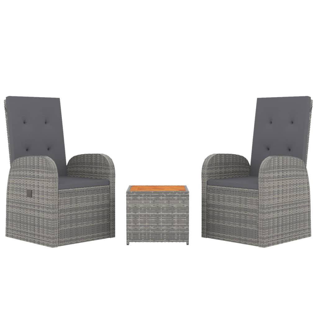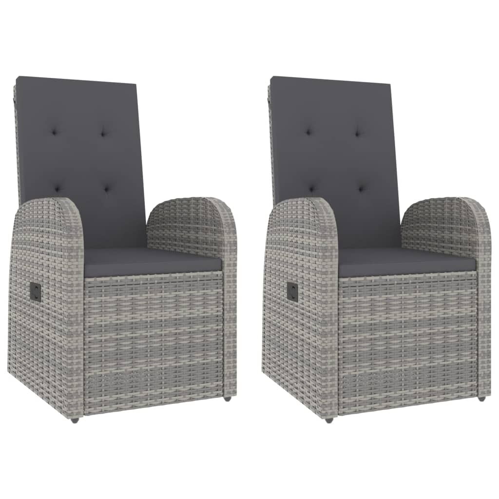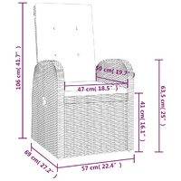 Colour: Dark grey Garden chair:Colour: GreyMaterial: PE rattan, steelSitting dimensions: 57 x 69 x 106 cm (W x D x H)Lying down dimensions: 57 x 106 x 85 cm (W x D x H)Seat size: 47 x 50 cm (W x D)Seat height from the ground: 41 cmArmrest height from the ground: 63.5/61.5 cmTable:Colour: GreyMaterial: PE rattan, powder-coated steel, solid acacia wood with an oil finishDimensions: 45 x 45 x 40 cm (W x D x H)Cushion:Colour: Dark greyCover material: Fabric (100% polyester)Seat cushion filling material: FoamBack cushion filling material: FibreSeat cushion thickness: 4 cmBack cushion thickness: 4 cm Delivery contains:2 x Garden chair1 x Table2 x Seat cushion2 x Back cushion