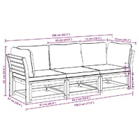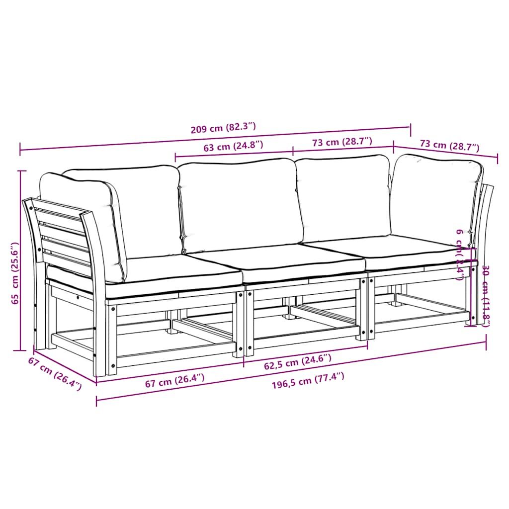 This wooden garden lounge set with cushions has an elegant design and is a great choice for relaxing and enjoying in the garden or patio. Solid acacia wood: Solid acacia wood is a beautiful natural material. Acacia wood is a tropical hardwood, which is dense, sturdy, and durable.Comfortable seat experience: The backrest and the thickly-padded cushions make the garden sofa set more comfortable to sit on.Slatted design: The slatted design of the wooden lounge set effectively prevents water from pooling, ensuring that the seat remains dry and free from potential rot.Modular design: This outdoor furniture set has a modular design, making it completely flexible and easy to move around, so you can create a customised outdoor furniture arrangement. Good to know:To make sure your outdoor furniture stays beautiful, we recommend protecting it with a waterproof cover.