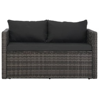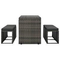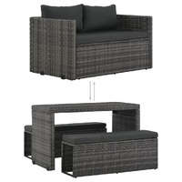 This versatile poly rattan dining set consists of 1 table, 2 benches, 2 pillows and 2 seat cushions. It will offer a stylish seating area for your garden or patio. The dining set can also be turned into a sofa. The set is easy to clean, hard-wearing and suitable for daily outdoor use due to the weather-resistant PE rattan. The powder-coated steel frame makes the set sturdy and stable. The seat is delivered with highly comfortable, thickly-padded seat cushions and back cushions for ultimate comfort. The low-maintenance polyester fabric cushion covers can be removed and washed easily. The set is easy to assemble. Note: We recommend covering the set during rain, snow and frost for its best service to last.