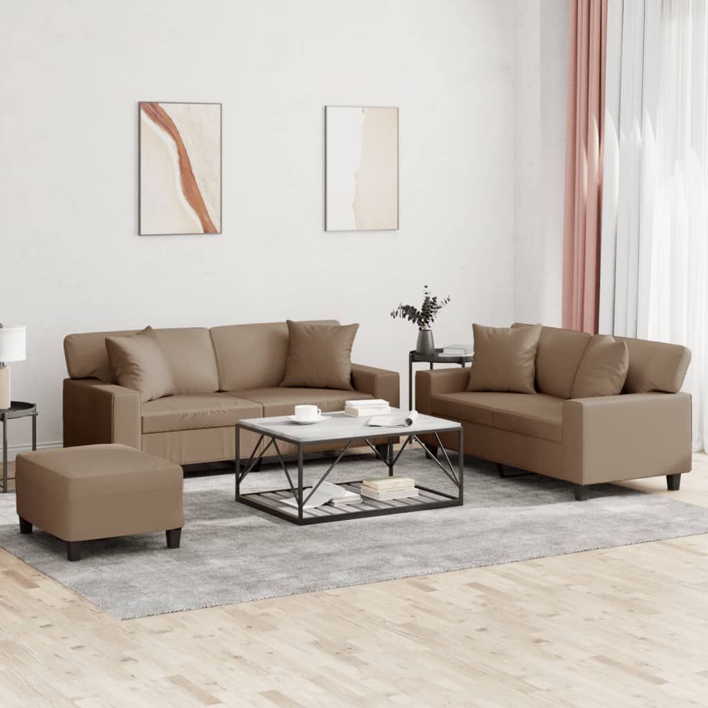 This sofa set is an excellent place for chatting, reading, watching TV or just relaxing. It is meant to be a focal point in your home. Durable faux leather: Faux leather is a highly durable material. It is resistant to stain, making it easy to clean with a damp cloth. The smooth surface also gives a luxurious look and the beauty of real leather.Sturdy and stable frame: The plywood and metal frame of the sofa seating ensures sturdiness and stability.Comfortable seat experience: The sofa is highly comfortable with the thickly padded seat, armrests, and back pillow.Practical couch pillows: These square throw pillows not only spruce up your decor but can also add extra comfort when you are seated or lying.Versatile footstool: The footstool is suitable for resting your feet when you lie on a sofa or offering you an additional seat in your room. Additionally, the simple design and compact size make it ideal for almost all your living spaces.