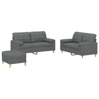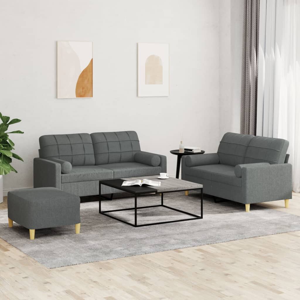 This sofa set is an excellent place for chatting, reading, watching TV or just relaxing. It is meant to be a focal point in your home. Durable fabric: The fabric features a simple and clean look while remaining breathable and long-lasting.Sturdy and stable frame: The plywood and metal frame of the sofa seating ensures sturdiness and stability.Comfortable seat experience: The sofa is highly comfortable with the thickly padded seat, armrests and back pillow.Practical roll pillows: These cylinder pillows not only spruce up your decor, but can also add extra comfort when you are seated or lying.Versatile footstool: The footstool is suitable for resting your feet when you lie on a sofa, or offering you an additional seat in your room. Additionally, the simple design and compact size make it ideal for almost all your living spaces.