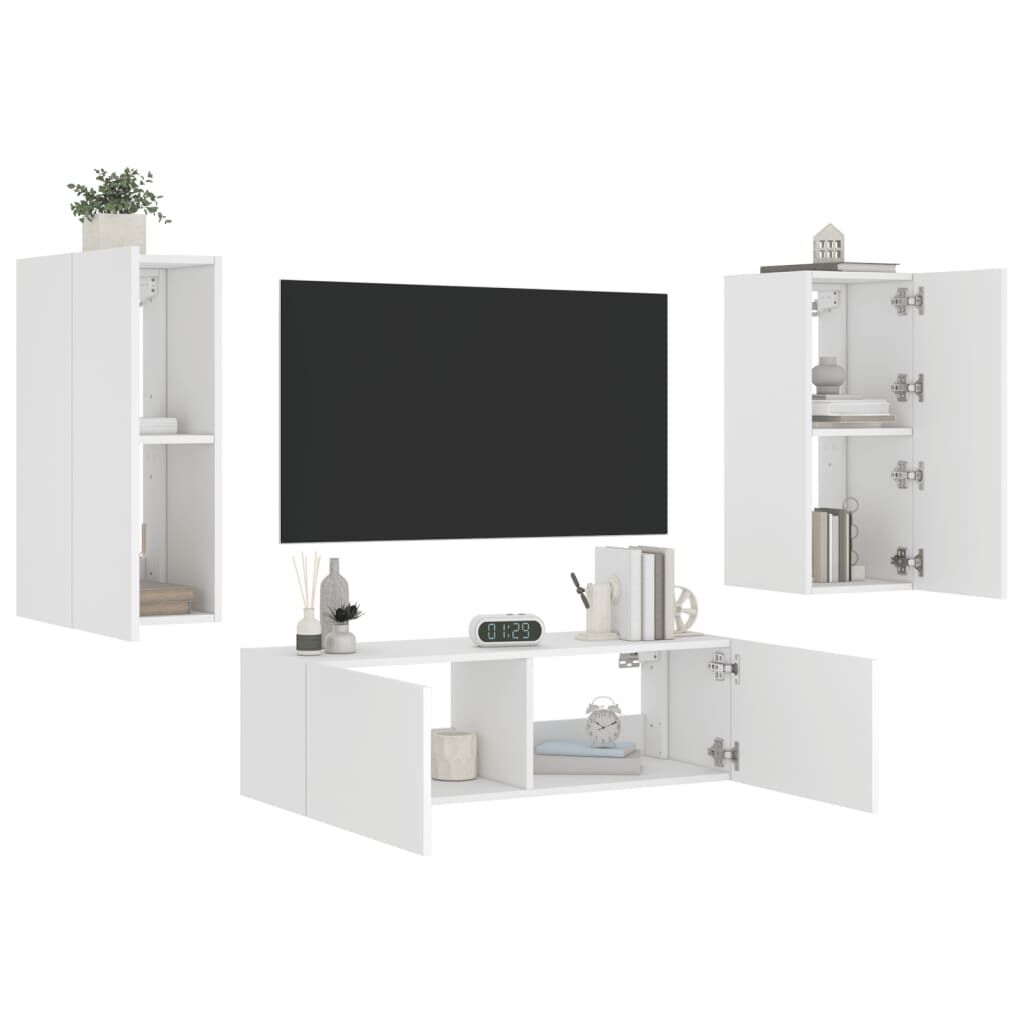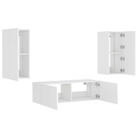 These TV wall cabinets with LED lights are the perfect solution for your living space to maximise space and keep the floor areas uncluttered. Durable material: The engineered wood is of exceptional quality with smooth surface and also features strength, stability and resistance to moisture. Made of engineered wood, these floating TV units are sturdy and durable.Ample storage space: The TV wall units have ample storage space to place your DVD players, books, magazines or other decorative items.RGB LED lights: The wall media units are equipped with vibrant RGB LED lights. With various customisable menus, you can effortlessly change the colour of the lights and even set them to adjust automatically.Wall-mounted design: These TV units with storage can be wall-mounted to add extra storage space. That way, you can maximise your floor space and keep the area clean. Good to know:Screws and plugs for inside the wall are not included. We advise to find and use screws and plugs suitable specifically for your walls. If you're not sure, you can consult with a professional. Please read and follow each step of the instructions.The product has a USB connector that requires a certified 5V USB power source (not included).