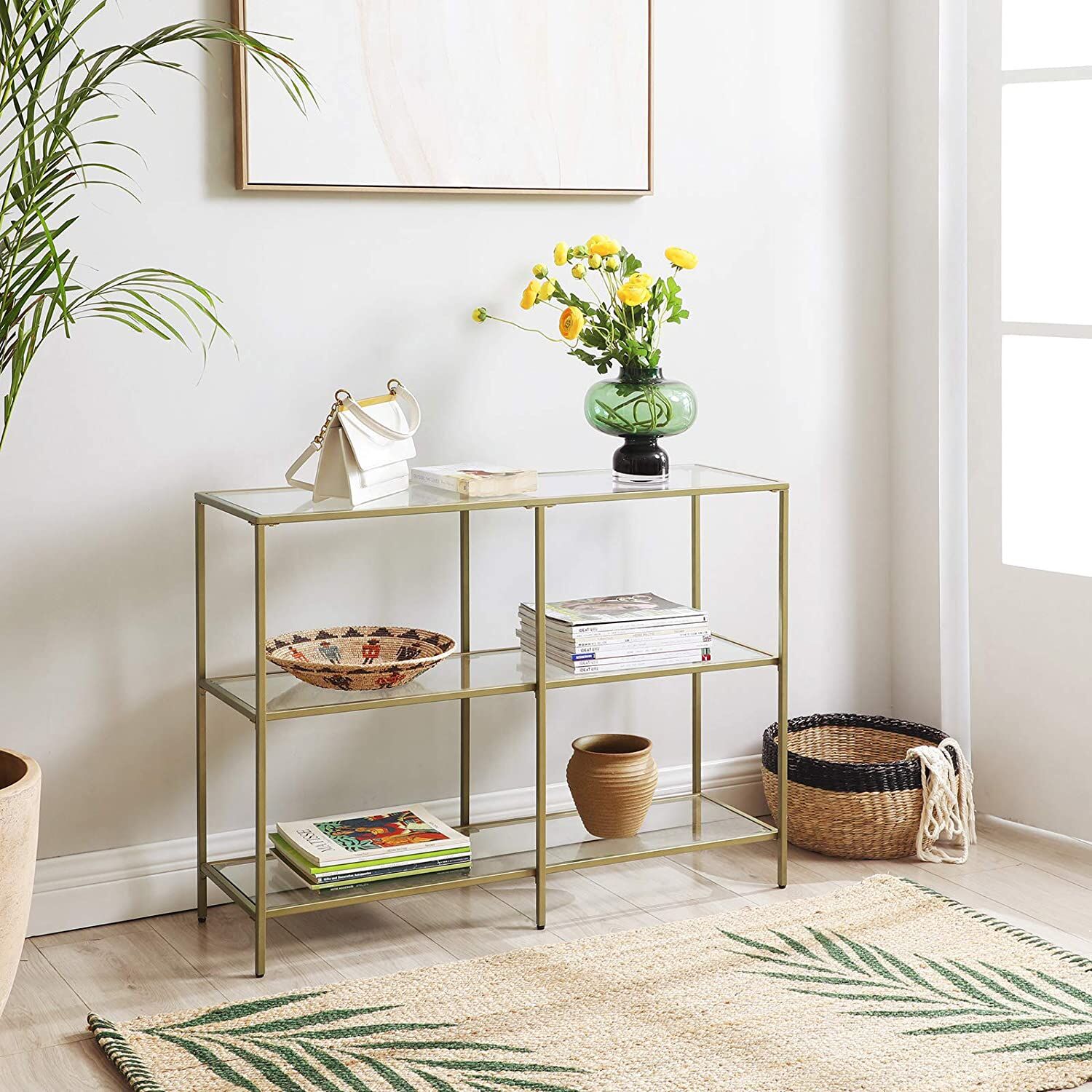 Perfect Match: 6 mm tempered glass and a sturdy metal frame unite like they were made just to be together, each level of this 100 x 30 x 73 cm (L x W x H) console table supports up to 10 kg, perfect for a collection of books or potted plants