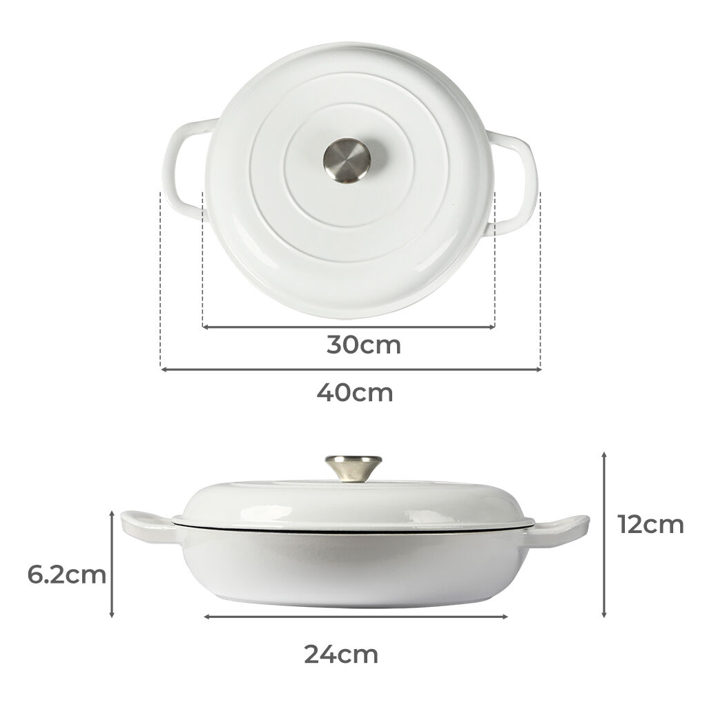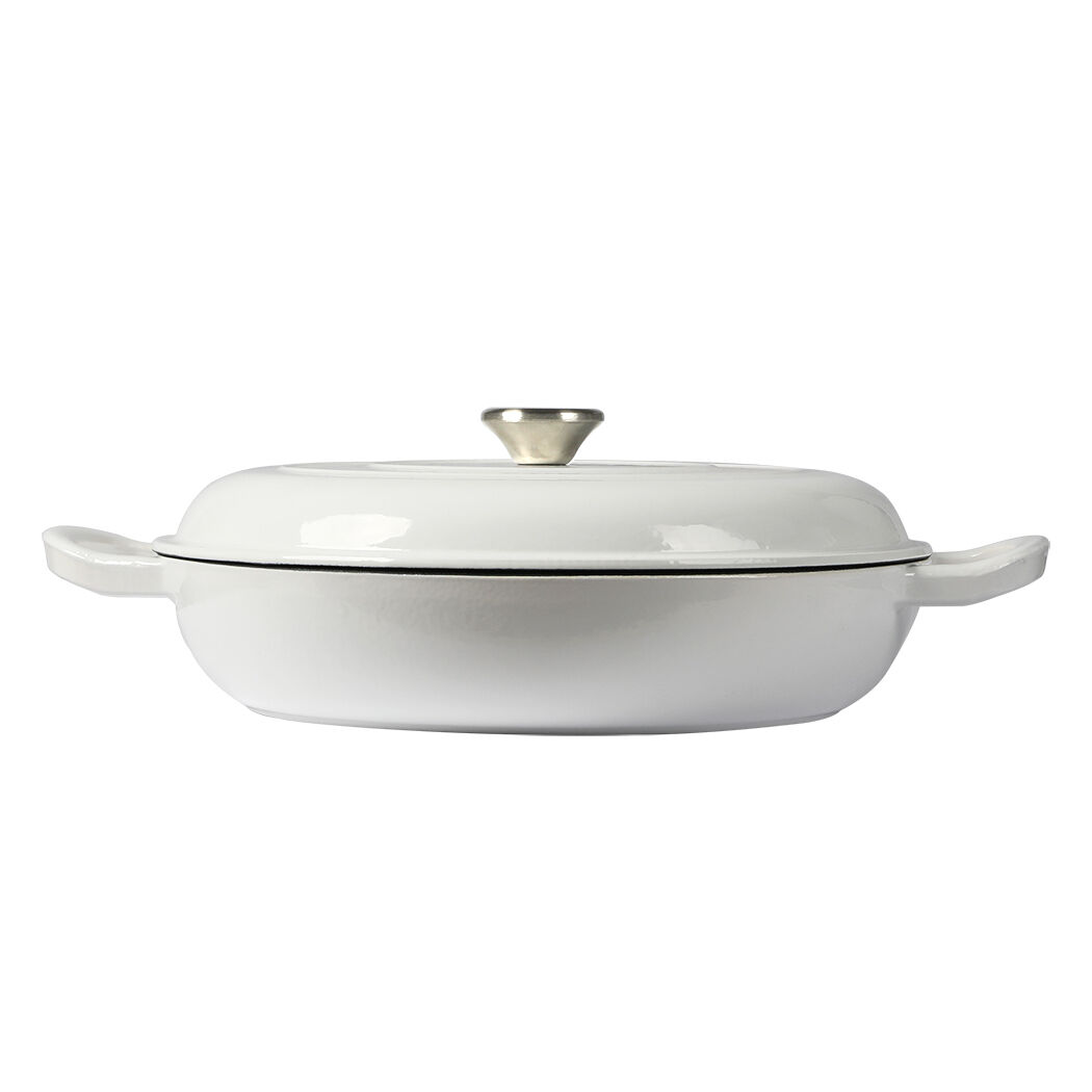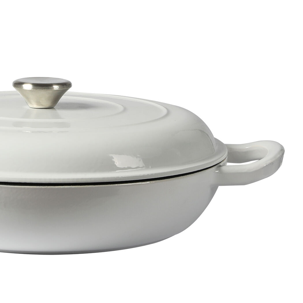 Cast iron pan holds the heat. Fitted lid holds heat in for faster cooking. Stays hotter for longer. You can cook in heavy cast iron for years and years. Non-stick enamel coating last longer than other types of stick coating.