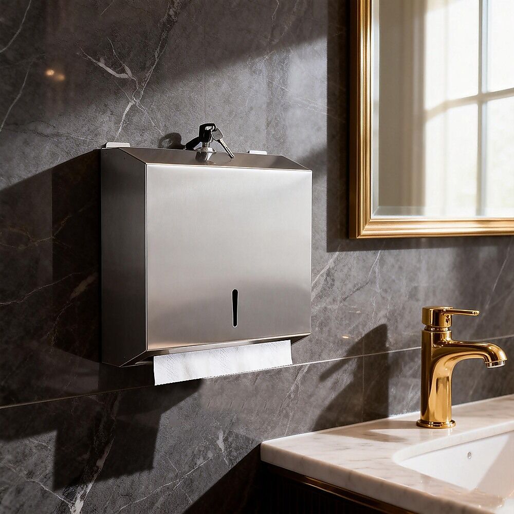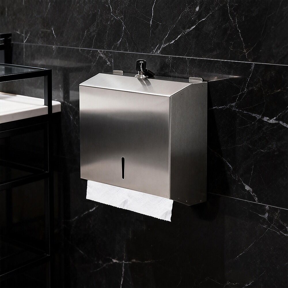 Made from high-grade stainless steel, this paper towel dispenser offers excellent durability and reliability for long-term use. The wall mounted design maximises space while allowing quick and easy access to paper towels when needed. Available in punched or unpunched options for flexible installation, it mounts securely to the wall. Product dimensions are 11.81L x 11.02W, providing practical capacity without taking up excess space.