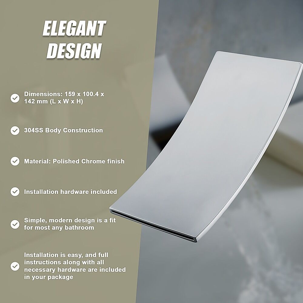 The Waterfall Bath Spout measures 159 x 100.4 x 142 mm (L x W x H). It is coated in a durable chrome finish that looks terrific and which will keep its shine for years to come. The simple, modern design is a fit for most any bathroom, and the wide-mouthed construction offers a pleasing cascade of water to relieve the stress of the day or invigorate you for the day to come. Installation is easy, and full instructions along with all necessary hardware are included in your package.