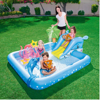 Make a splash this summer with the Bestway Fantastic Aquarium Play Center — a vibrant, sea-themed inflatable pool packed with interactive fun for kids! Designed with colorful aquatic graphics and playful inflatable sea creatures, this all-in-one water play area features a detachable slide, a splash pool, and even a palm tree sprinkler that connects to your garden hose for a refreshing spray.