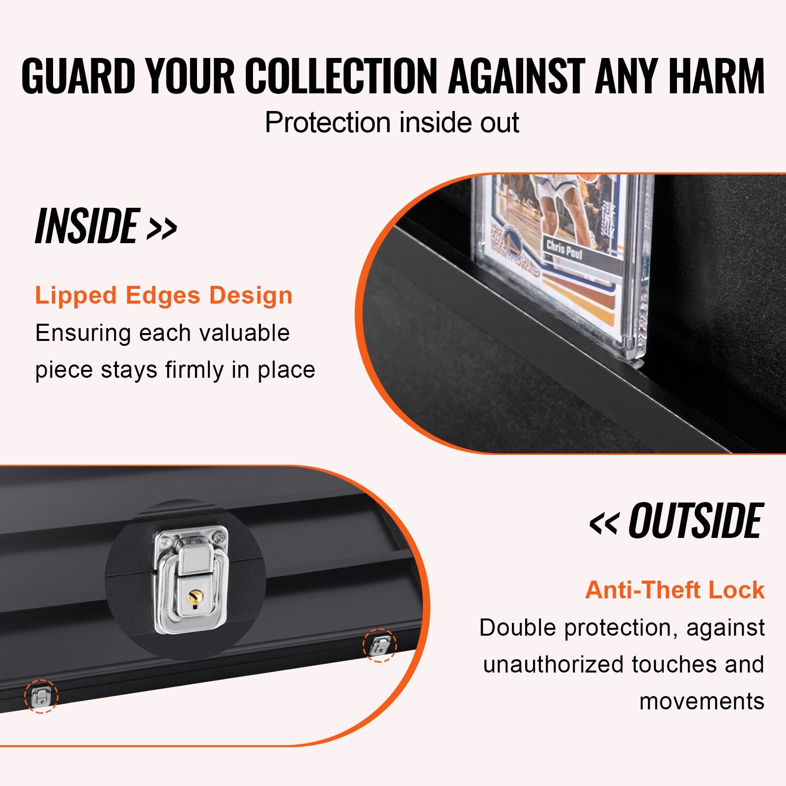 Our sports card display case features soft black felt lining on the interior, shielding cards from scratching while maintaining a dry environment with excellent moisture absorption. On the exterior, two gold-plated anti-theft locks deter unauthorized touching or movement by others. Elevate your showcasing experience with peace of mind.