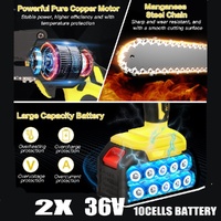 2 Powerful Batteries Included This wood cutting battery powered chainsaw comes with 2 rechargeable 36V 18650 Li-on batteries,The battery uses 10 cells ,providing 3500W super strong power, each of which can support 40-50min runing time. You can get variable stepless speed by adjusting the intensity you hold the trigger.
