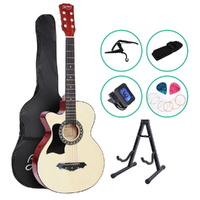 Sitting out on the porch playing guitar and singing with your mates or even going away sitting around the campfire and singing in harmony is definitely enjoyable and fun; and you will need this affordable Acoustic Cutaway Steel-Stringed Guitar to complete your performance.Crafted from the finest materials, the guitar is made of laminated linden for its top, back, and side. With the Hard Wood neck and Maple Wood Fingerboard, the cutaway delivers beautiful sound and chic look at one time. The delicate process of manufacture including bracing and finishing techniques, thickness and wood tuning guarantee this guitar a real pleasure to play.