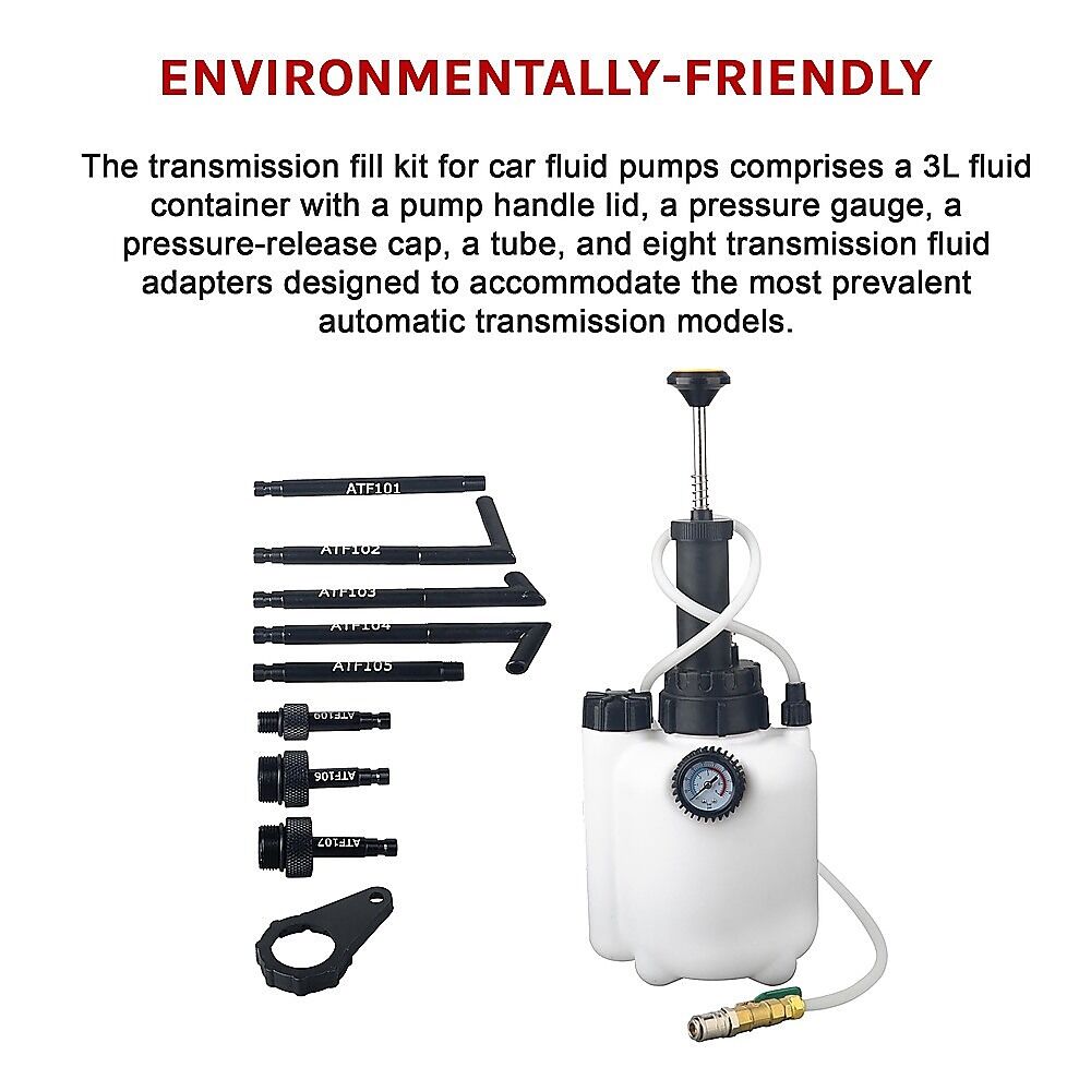 $96.29Take the hassle out of automatic transmission fluid changes with this 3L Manual Transmission Oil Filling System. Built for durability and efficiency, this high-quality hand pump kit is ideal for workshops, garages, and at-home mechanics. It features a robust 3-litre container, precision pressure gauge, and 8 automatic transmission fluid (ATF) adaptors compatible with a wide range of vehicle models.