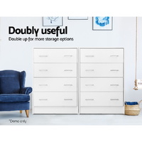 $118.43If you find yourself in need of some extra storage space, look no further than our practical and handsome Artiss 4-drawer Tallboy. With its effortlessly simple and contemporary design, this beauty is crafted from 15mm thick particle board and features a flawless paper finish with PVC edging that will easily match your existing home decor. It provides plenty of storage space with four generously sized drawers for all your personal essentials. The drawers are easy to open and close, thanks to the anti-rust coated metal drawer runners that always ensure smooth operation, and the elegant double handles make it convenient to access the drawers without hassle. With such a classic design, ample space and flexible style, you just can't go wrong with the Artiss 4-drawer Tallboy.