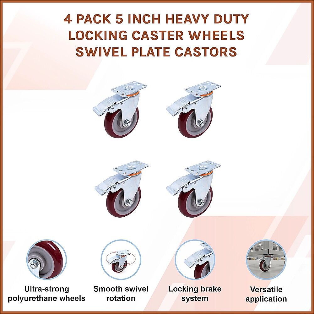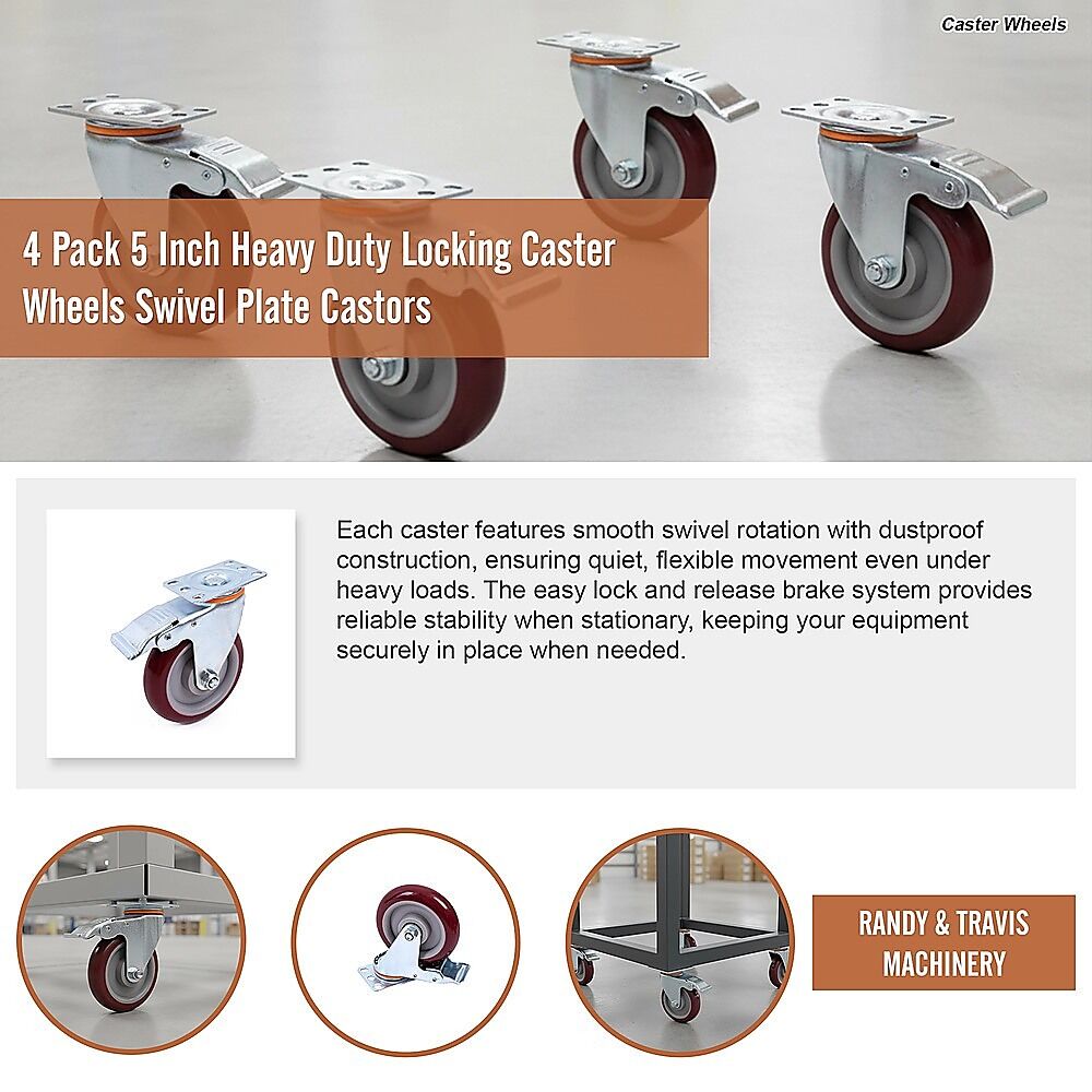 Upgrade your equipment mobility with these heavy duty 5-inch locking caster wheels, designed for strength, smooth rolling, and long-term durability. Built with ultra-strong polyurethane wheels, these castors resist most acids, chemicals, and abrasion, making them ideal for demanding workshop, industrial, and commercial environments.