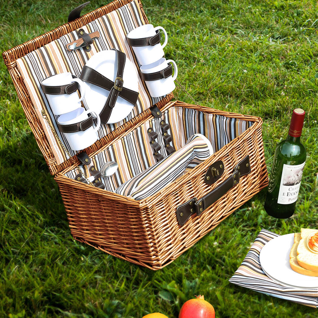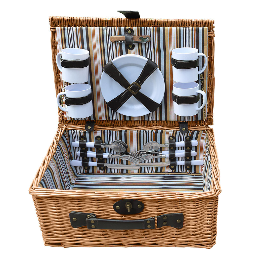$69.51A must have for picnic lovers ! Take it with you when going for a trip ! Crafted from quality willow elegant and sturdy, enough large for your favourite fruits, wine and other foods. Features PU leather straps to keep cutlery, wine glass, plates and corkscrew in place. Further more, a colour matching ground blanket in basket to sit on. A handle for easy transportation, great for picnics and other outdoor gatherings.