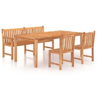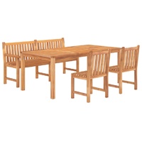 This wooden garden dining set, with an elegant and contemporary design, is a great choice for dining or relaxing in the garden. Solid teak wood: Solid teak wood is a beautiful natural material. It has been seasoned, kiln dried and then fine sanded to give a very smooth appearance. Teak wood is known for its exceptional strength and weather resistance.Sturdy tabletop: This dinner table provides you with a sturdy tabletop. You can place your snacks, drinks, and any of your favourite decorations.Water-resistant feature: With its water-resistant feature and classic look, you can place the garden furniture set anywhere around your sweet home, whether indoors or outdoors!Comfortable seating experience: Each bench and dinner chair has a backrest, which makes it highly comfortable to sit on. Note:Each product comes with an assembly manual in the box for easy assembly.In order to extend the life of your outdoor furniture, we recommend you to protect it with a waterproof cover.