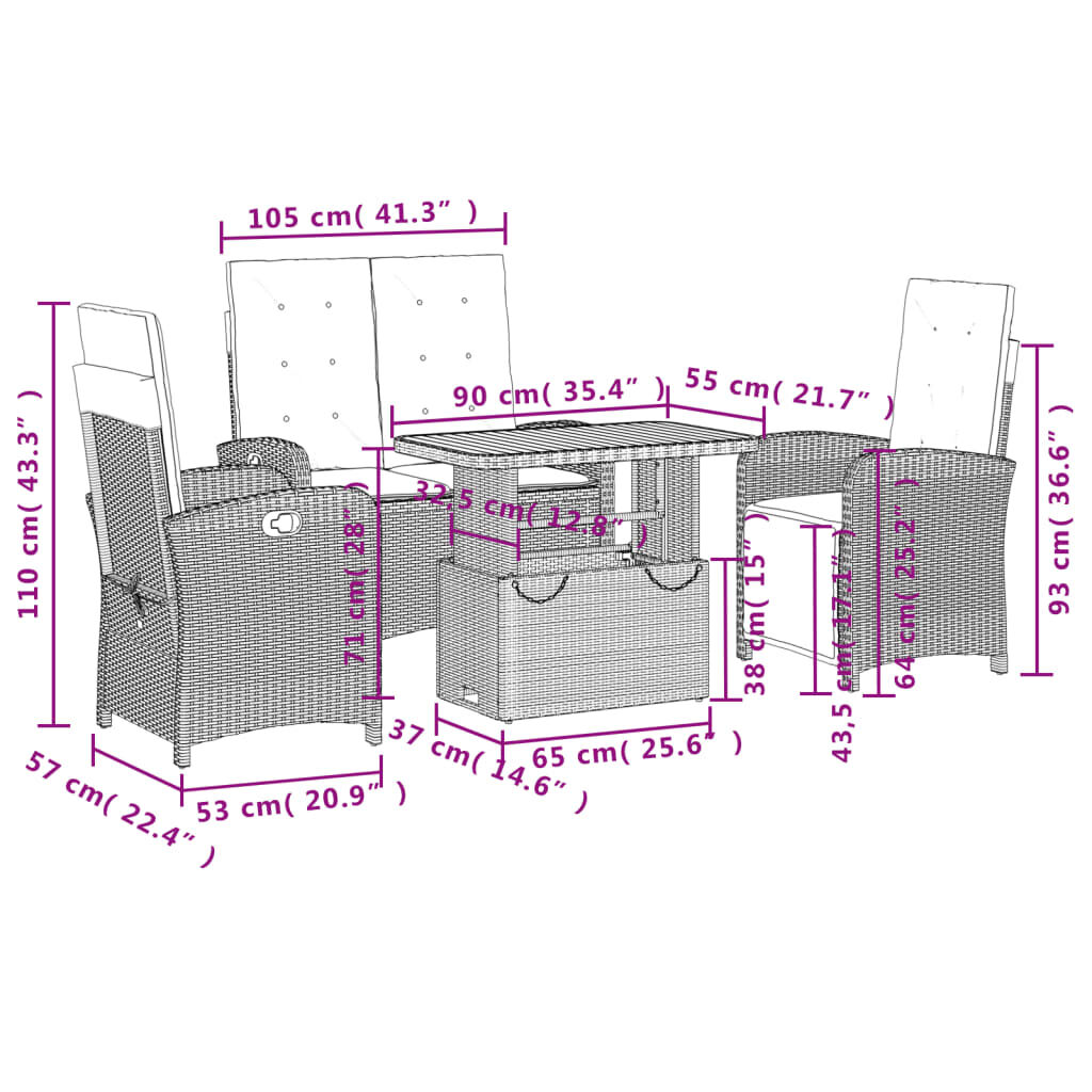 This garden dining set is a great choice for al fresco dining or just relaxing in the garden, backyard, or on the patio. Durable material: PE rattan, also known as poly rattan, is a strong, low-maintenance synthetic material that looks like natural rattan. It's lightweight, easy to clean, and commonly used for outdoor furniture due to its durability and weather-resistant properties.Adjustable backrest: This garden seat has a handle. You can adjust the backrest to any position by pulling the handle, and quickly return it to its original position.Adjustable tabletop: The tabletop can be lifted to make the table higher, which transforms the outdoor table from a coffee table to a dining table. It's perfect for having guests over or eating meals outside.Removable and washable cover: These seat cushions feature removable covers for easy washing and maintenance. The back cushions have a flap at the back for easy attachment to the backrests.Comfortable seat experience: This outdoor furniture, complete with thickly padded cushions, offers a comfortable seating experience. Good to know:To make sure your outdoor furniture stays beautiful, we recommend protecting it with a waterproof cover.