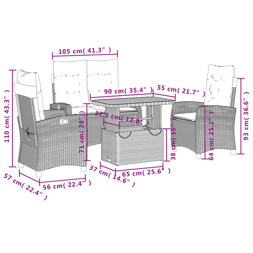 This garden dining set is a great choice for al fresco dining or just relaxing in the garden, backyard, or on the patio. Durable material: PE rattan, also known as poly rattan, is a strong, low-maintenance synthetic material that looks like natural rattan. It's lightweight, easy to clean, and commonly used for outdoor furniture due to its durability and weather-resistant properties.Adjustable backrest: This garden seat has a handle. You can adjust the backrest to any position by pulling the handle, and quickly return it to its original position.Adjustable tabletop: The tabletop can be lifted to make the table higher, which transforms the outdoor table from a coffee table to a dining table. It's perfect for having guests over or eating meals outside.Removable and washable cover: These seat cushions feature removable covers for easy washing and maintenance. The back cushions have a flap at the back for easy attachment to the backrests.Comfortable seat experience: This outdoor furniture, complete with thickly padded cushions, offers a comfortable seating experience. Good to know:To make sure your outdoor furniture stays beautiful, we recommend protecting it with a waterproof cover.