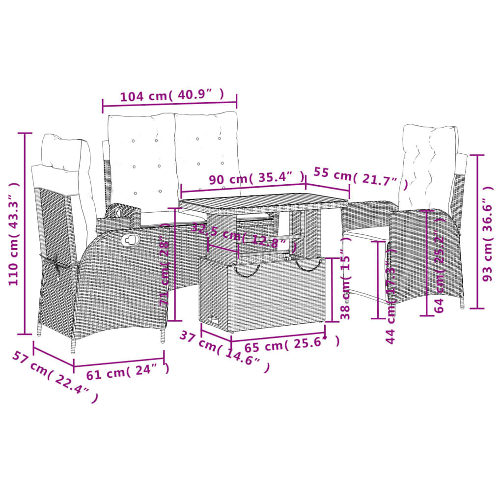 This garden dining set is a great choice for al fresco dining or just relaxing in the garden, backyard, or on the patio. Durable material: PE rattan, also known as poly rattan, is a strong, low-maintenance synthetic material that looks like natural rattan. It's lightweight, easy to clean, and commonly used for outdoor furniture due to its durability and weather-resistant properties.Adjustable backrest: This garden seat has a handle. You can adjust the backrest to any position by pulling the handle, and quickly return it to its original position.Adjustable tabletop: The tabletop can be lifted to make the table higher, which transforms the outdoor table from a coffee table to a dining table. It's perfect for having guests over or eating meals outside.Removable and washable cover: These seat cushions feature removable covers for easy washing and maintenance. The back cushions have a flap at the back for easy attachment to the backrests.Comfortable seat experience: This outdoor furniture, complete with thickly padded cushions, offers a comfortable seating experience. Good to know:To make sure your outdoor furniture stays beautiful, we recommend protecting it with a waterproof cover.