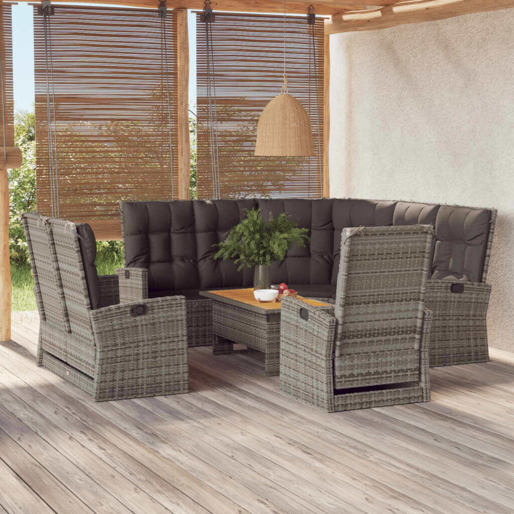 $936.23This stylish and comfy garden lounge set is an ideal choice for you to relax and enjoy the weather, take a nap, or chat with your friends or family. Durable material: PE rattan, also known as poly rattan, is weather resistant and easy to clean. It remains beautiful on the outside for a long period of time. It's more economical than other materials, while offering great quality, convenience and an aesthetic look.Solid acacia wood: The tabletop is made of solid acacia wood. Solid acacia wood is a beautiful natural material. Acacia wood is a tropical hardwood, which is dense, sturdy, and durable.Sturdy and stable frame: The powder-coated steel frames make the lounge set sturdy and stable for daily outdoor use.Lift-up tabletop: The adjustable tabletop height mechanism of the patio table provides the perfect height for writing, reading or drinking.Adjustable backrest: Thanks to the gas lift mechanism, the backrest is adjustable to fit your positions. By touching the button on the side, the backrest can recline, for a comfortable position.Comfortable seating: These thickly padded and removable cushions are highly comfortable that add an extra comfortable seating experience. Good to know: To make assembly as easy as possible, each product is delivered with a manual.Note: To make sure your outdoor furniture stays beautiful, we recommend protecting it with a waterproof cover.