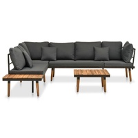 This 4-piece garden sofa set will make a great addition to your outdoor living space. It will add a touch of modern elegance to your patio, balcony or garden with its understated yet stylish design. Our easy-to-clean and hardwearing garden furniture set is made of solid acacia wood, a tropical hardwood, which is weather resistant and durable for years to use. The sturdy steel frame makes the set very stable and durable. You could also put some snacks, drinks, tea cups, books or other small items on the small wooden part. This set is delivered with highly comfortable, thickly padded cushions and pillows. The low-maintenance polyester covers can also be removed and washed. This garden lounge set is easy to assemble.
