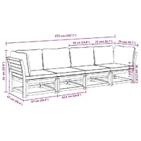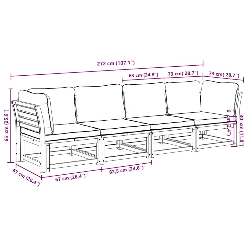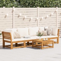 This wooden garden lounge set with cushions has an elegant design and is a great choice for relaxing and enjoying in the garden or patio. Solid acacia wood: Solid acacia wood is a beautiful natural material. Acacia wood is a tropical hardwood, which is dense, sturdy, and durable.Comfortable seat experience: The backrest and the thickly-padded cushions make the garden sofa set more comfortable to sit on.Slatted design: The slatted design of the wooden lounge set effectively prevents water from pooling, ensuring that the seat remains dry and free from potential rot.Modular design: This outdoor furniture set has a modular design, making it completely flexible and easy to move around, so you can create a customised outdoor furniture arrangement. Good to know:To make sure your outdoor furniture stays beautiful, we recommend protecting it with a waterproof cover.