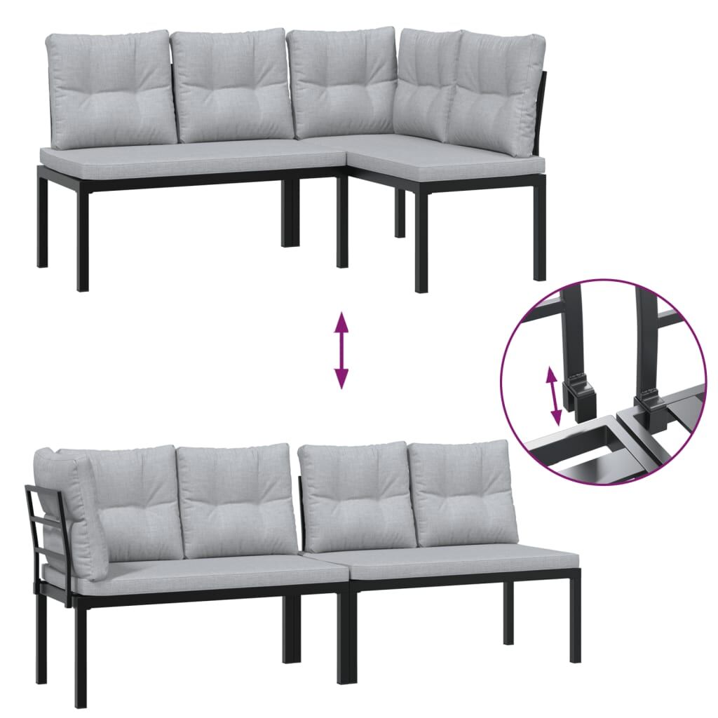 This garden sofa set is the perfect addition to your backyard, terrace, or patio, providing a comfortable and inviting space for chatting with family and friends or simply relaxing and enjoying the outdoors. Robust and stable frame: The powder-coated steel frame is strong, stable, durable, and resistant to corrosion and harsh weather, ensuring long-lasting performance.Comfortable seat experience: This outdoor furniture, complete with a thickly padded cushion, offers a comfortable seating experience.Adjustable seat panel: The seat panel of the outdoor stool can be lifted up as per your preference.Removable and washable cover: These seat cushions feature removable covers for easy washing and maintenance.Modular design: This outdoor furniture set has a modular design, making it completely flexible and easy to move around, so you can create a customised outdoor furniture arrangement. Good to know:To make sure your outdoor furniture stays beautiful, we recommend protecting it with a waterproof cover.