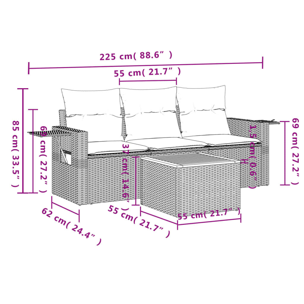 This garden sofa set is the perfect addition to your backyard, terrace, or patio, providing a comfortable and inviting space for chatting with family and friends or simply relaxing and enjoying the outdoors. Durable material: PE rattan, also known as poly rattan, is a strong, low-maintenance synthetic material that looks like natural rattan. It's lightweight, easy to clean, and commonly used for outdoor furniture due to its durability and weather-resistant properties.Convenient side table: This outdoor furniture features a foldable side table with a gas spring on the armrests, providing a convenient spot to keep your essentials within easy reach.Stable and easy-to-clean tabletop: This garden table has an acacia wood top that is sturdy, durable, and easy to clean with a damp cloth.Removable and washable cover: These seat cushions feature removable covers for easy washing and maintenance.Modular design: This outdoor furniture set has a modular design, making it completely flexible and easy to move around, so you can create a customised outdoor furniture arrangement. Good to know:To make sure your outdoor furniture stays beautiful, we recommend protecting it with a waterproof cover.