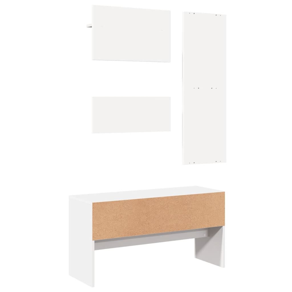 Create a warm and welcoming environment next to your door with this hallway furniture set! Stable and durable material: Engineered wood is a durable and stable material with a smooth surface that is resistant to moisture, warping, and splitting, making it a reliable choice for a variety of projects.3-in-1 hallway storage unit: This set has everything you need to keep your entryway neat and tidy. It includes a shoe bench with drawers, a mirror, and two coat racks for storing shoes, coats, and accessories.Multifunctional hall bench: This versatile bench serves a dual purpose as a storage cabinet for shoes and accessories and as a convenient spot in the hallway for putting on or taking off your shoes.6 hanging options: The 6 hooks are placed at two different heights to be accessible to everyone and accommodate items of varying lengths.Space saving: The wall-mounted design maximises unused wall space, converting it into a compact and efficient storage area, making this furniture ideal for small or limited spaces.