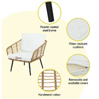 $485.03Looking to create a chic and gorgeous outdoor setting? The Gardeon 4-piece rattan outdoor lounge set is a must purchase. It will liven up your outdoor space and help you achieve an elegant space where you can enjoy day and night and summer and winter. This 4-seater set comprises of two single sofas, one 2-seater sofa, and a matching centre table. You can arrange them in multiple ways to suit your space. Its beautiful and versatile design makes it perfect for both indoor and outdoor use. All the seat and back cushions come with 8cm thickness and high-density foam padding that ensures your comfort always. Additionally, the removable cushion covers are water-resistant and UV-resistant to suit different seasons. Furthermore, our outdoor set features a lovely handwoven rattan weave for a touch of tropical charm and decorative effect, and the UV-resistant PE wicker makes this lounge set perfect for all-weather use. The large table with 5mm thick tempered glass top, non-slip suction pads, and durable powder-coated frame ensures strength and durability. This rattan outdoor set will withstand the test of time due to its durable and sturdy structure and powder-coated steel frame. You can create a praise-worthy spot with just a little creativity that will wow your guests. Shop it for your home today.