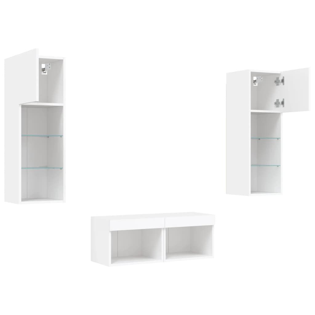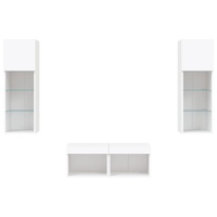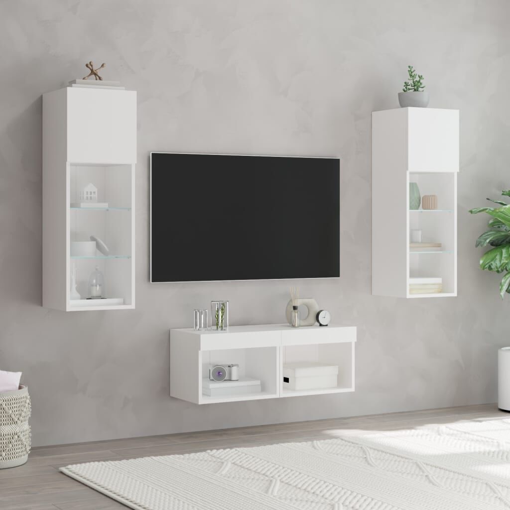 These TV wall cabinets with LED lights are the perfect solution for your living space to maximise space and keep the floor areas uncluttered. Durable material: The engineered wood is of exceptional quality with smooth surface and also features strength, stability and resistance to moisture. Made of engineered wood, these floating TV units are sturdy and durable.Ample storage space: The TV wall units have ample storage space to place your DVD players, books, magazines or other decorative items.RGB LED lights: The wall media units are equipped with vibrant RGB LED lights. With various customisable menus, you can effortlessly change the colour of the lights and even set them to adjust automatically.Wall-mounted design: These TV units with storage can be wall-mounted to add extra storage space. That way, you can maximise your floor space and keep the area clean. Good to know:Screws and plugs for inside the wall are not included. We advise to find and use screws and plugs suitable specifically for your walls. If you're not sure, you can consult with a professional. Please read and follow each step of the instructions.The product has a USB connector that requires a certified 5V USB power source (not included).
