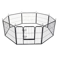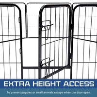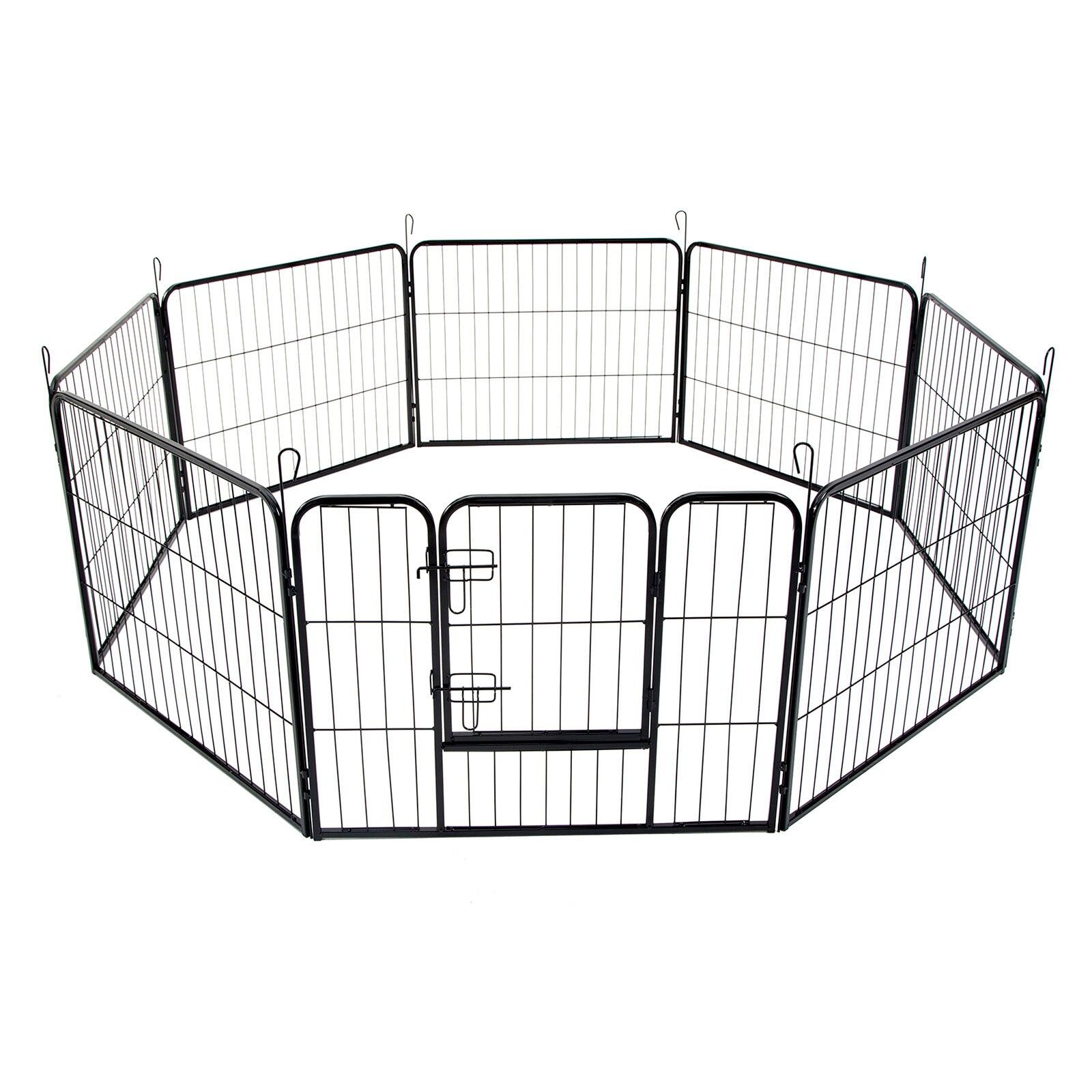 It is a multi-configuration playpen with 8 panels which allows you to turn your playpen into different shapes. The playpen is made of durable extra heavy duty steel frames construction with black powder coat finish. This fine finish provides long lasting protection and weather resistance. The access door has bolt latches and this ensures that your pet doesn?€?t have the opportunity to run away and the round edges ensure pet safety.