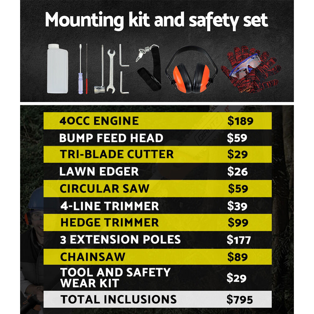 $291.39The GIANTZ Pro-series Chainsaw is the answer for people who are looking for doing serious cutting and bring it to the next level. Featuring a powerful 40cc, 4-stroke full crank engine for smoother starting and running, the chainsaw trims and cuts every gardening challenge in its path with minimum hassle. Efficient and lightweight in design and equipped with a comfortable D-handle, the chainsaw allows quick-connect coupling for easy change of attachments. In fact, up to nine attachments for every conceivable cutting job. Better still, the chainsaw also comes with three extra thick alloy extension poles which allows you to reach for those hard-to-get branches. Not least, the cutting equipment also features fine quality construction and cutting-edge technology to ensure the chainsaw remains reliable, durable and sharp consistently.