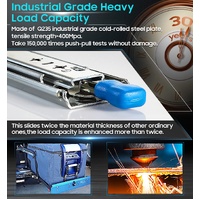 Double Thickening. Made of 2.0mm high-density thickened steel, which has anti-oxidation and high anti-rust ability and is durable. better bearing capacity. Up to 150kg/pair max capacity load. the service life of the slide rail could be 30 years at least.