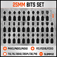 32x Short Bits: 3x PH1, 3x PH2, 2x PH3, 1x PZ1, 8x PZ2, 3x PZ3, 1xT10, 1x T15, 2x T20, 4x T25, 1x T30, 1x T40, 2x SL6mm.