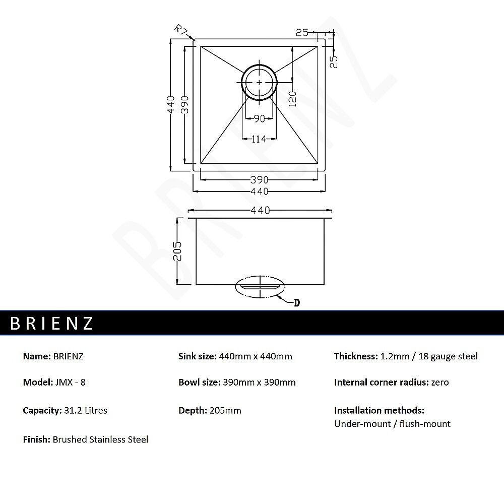 This single sink is made from hand-made 1.2mm-thick Type 304 stainless steel for a brilliant look that will last and last. It measures 440 x 440 x 205mm (L x W x D) with a 90mm drain opening and an above-average depth for added versatility. A strainer waste is included. Installation is either Undermount / Topmount-style. Undermount / Topmount brackets are included along with full installation instructions.