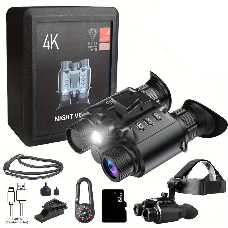The 4K Night Vision Goggles are designed for those who demand precision and clarity in low light. With an advanced CMOS sensor and infrared night vision technology, these goggles offer a 600 cm detection range and full-color 4K viewing capability. Equipped with 5X optical and 8X digital magnification, users can identify targets clearly at long distances.
