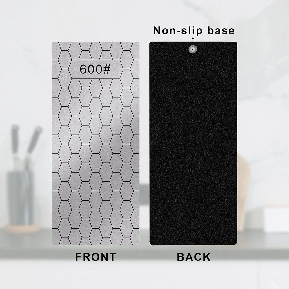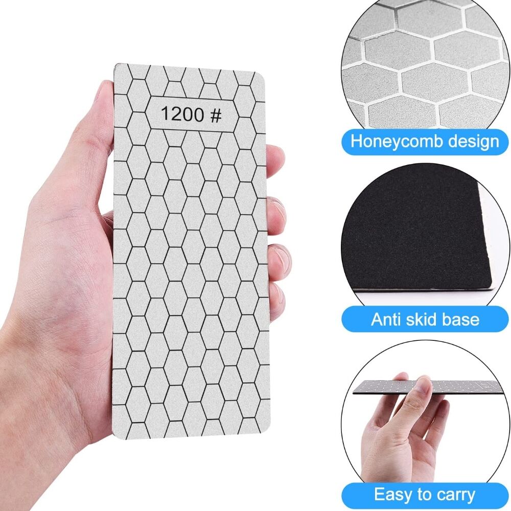 Premium Material: The sharpening stone is made of high-quality diamond material, which makes it easy to grind and endure for a long time. It's designed with a non-slippery pad on the back to protect your hands from hurting as the sharpening blade moves when sharpening.